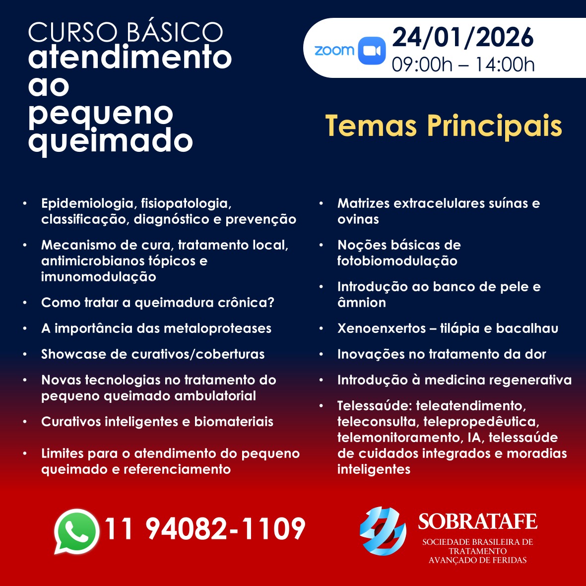 Este curso conta com o apoio institucional da SOBRATAFE (Sociedade Brasileira de Tratamento Avançado de Feridas), reforçando o compromisso com a qualidade científica e a atualização profissional na área de tratamento de queimaduras.